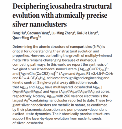 (功能材料研究院 通讯员 刘星辰)近日,我校功能材料研究院梁桂杰教授参与合作的研究论文《Deciphering icosahedra structural evolution with atomically precise silver nanoclusters》在《Science》期刊上正式发表(Science, 389, 6763: 921–924)。此为我校教师首次在国际顶级学术期刊《Science》上发表论文,清华大学与湖北文理学院为共同作者单位。