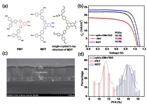 崔彬彬及其合作者设计合成了分别以“邻二噻吩苯”和“萘并双噻吩”为核心π-bridge的两种低成本三芳胺类衍生物PBT和NDT(图1a),并将在这两种Donor-π-Donor构型的有机小分子作为空穴传输层材料应用于钙钛矿太阳能电池器件(图1c)中。以基于spiro-OMeTAD分子的PSCs器件(最优PCE:18.1%,Reverse)为参照,在同样条件下,基于PBT的PSCs器件达到的最大光电转换效率为13.6%,而以相对于PBT具有更好平面共轭特征的NDT作为空穴传输层的PSCs器件最优光电转换效率可达到18.8%(图1b)。