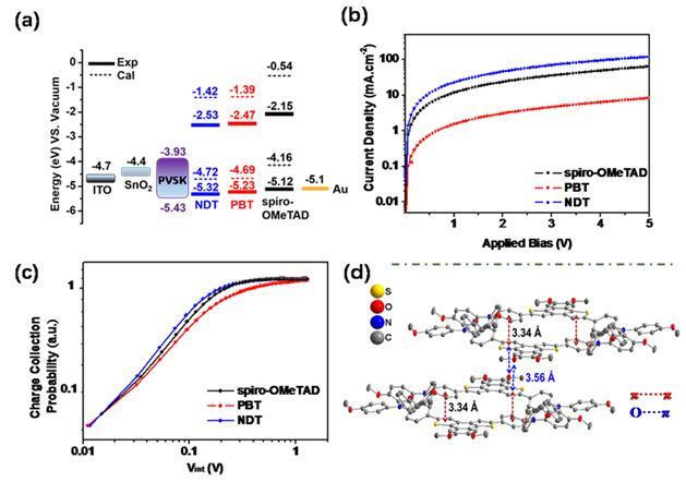 图2(a)三种有机分子的能级分布和与PVSK的匹配程度;(b)“SCLC”法测试有机分子的空穴迁移率;(c)三种有机分子的电荷收集概率PC;(d)NDT分子晶体结构中的π-π堆积和O-π堆积。
